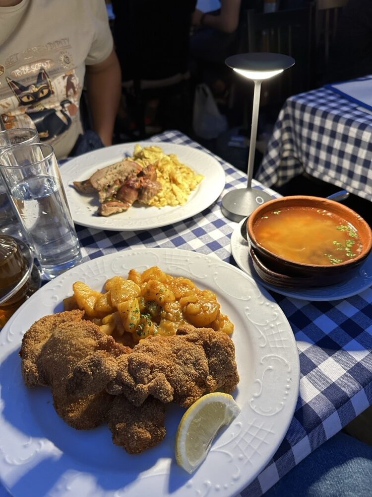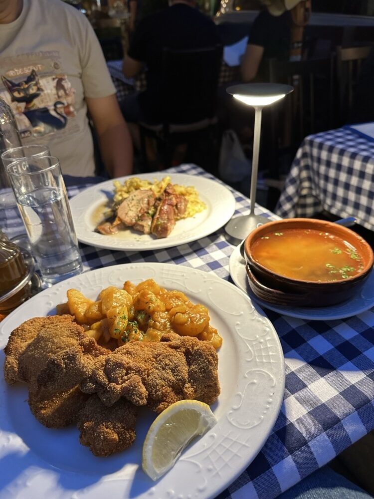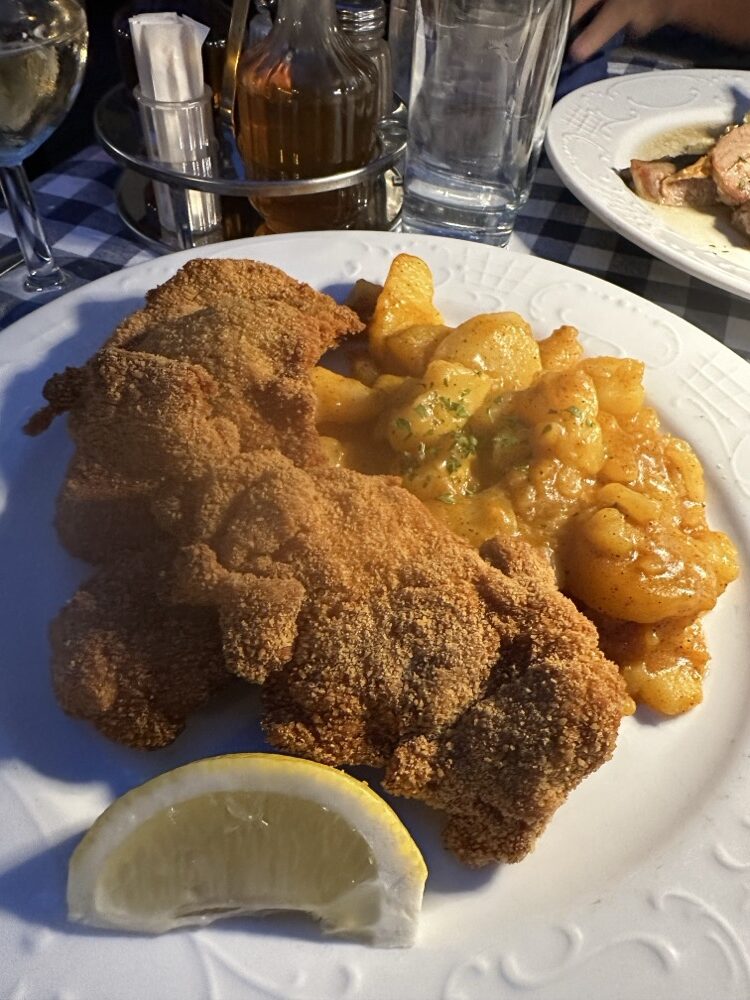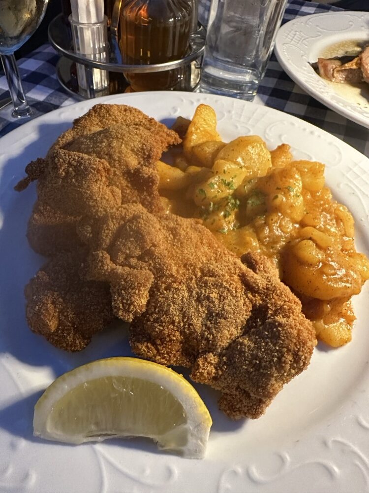 然後又點了牛肉湯4.8歐、炸雞10.5歐、配菜馬鈴薯3.6歐、兩杯白酒4歐